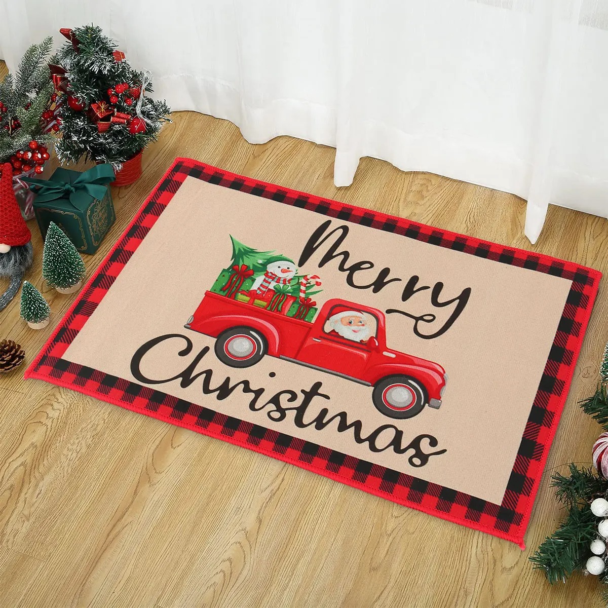 Le motif de « Merry Christmas » en lettres cursives noires, accompagné d’un élégant camion rouge transportant des cadeaux, un sapin de Noël et un bonhomme de neige, réchauffera les cœurs et illuminera chaque coin de votre maison. Imaginez les sourires de vos proches lorsqu’ils verront ce tapis accueillant, symbole de joie et de partage pendant la saison des festivités.