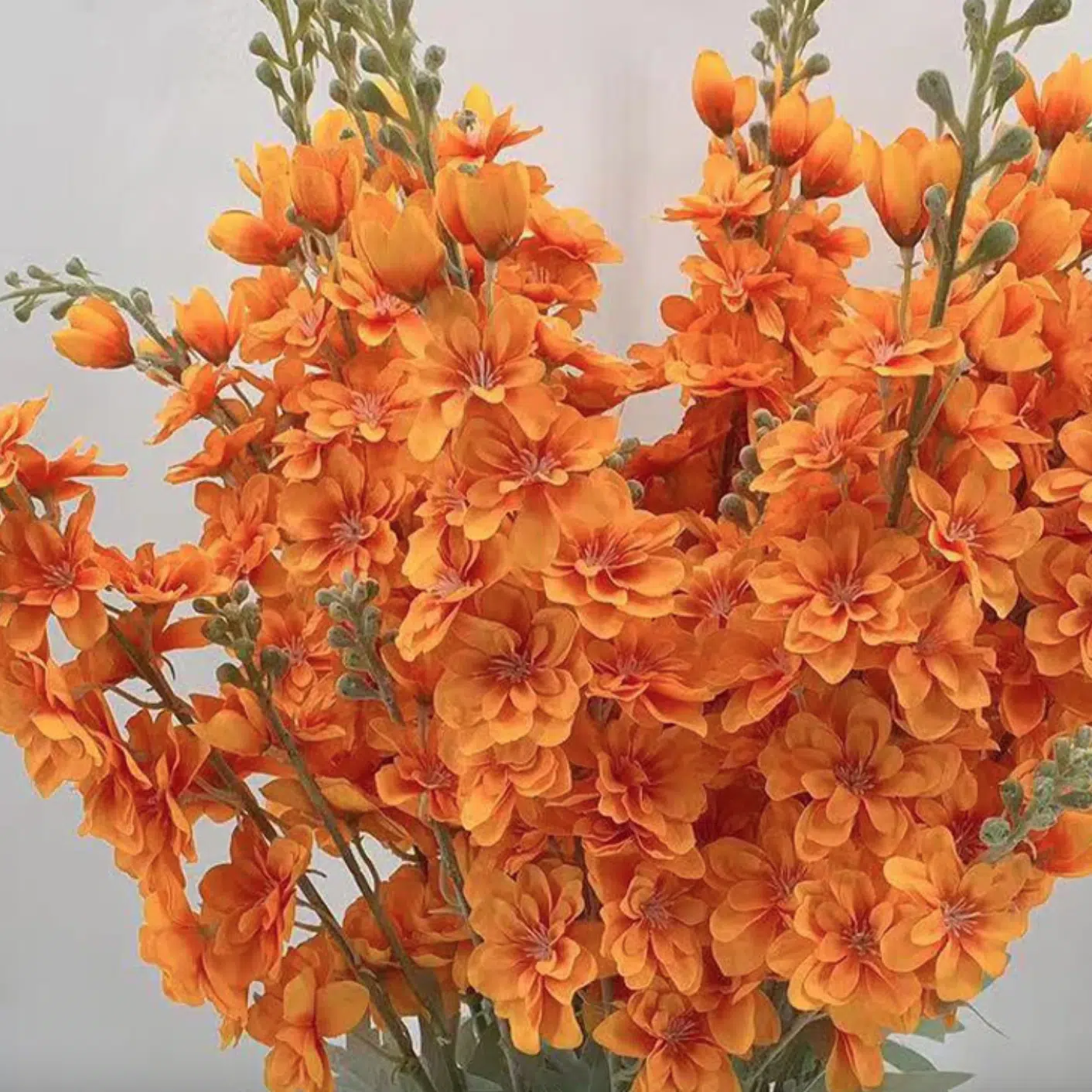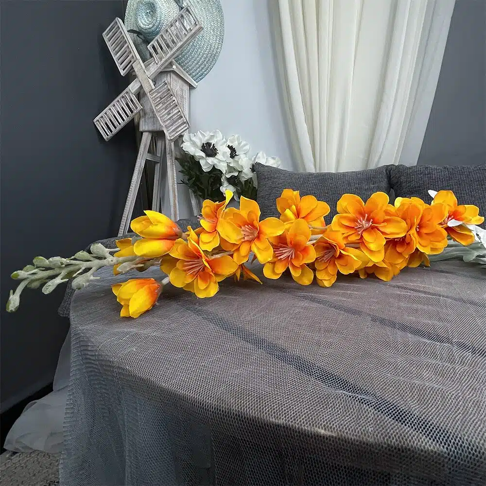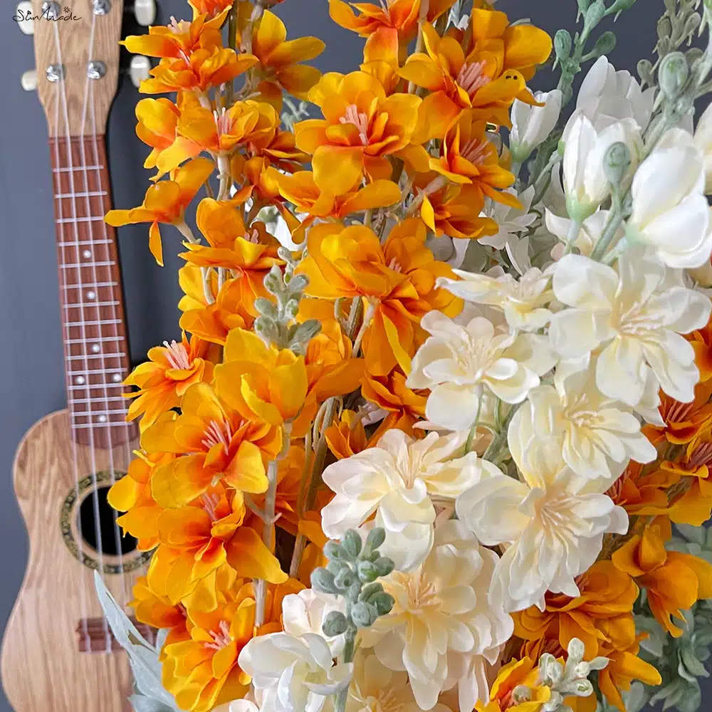 Réplique fidèle de la luxuriante Dauphinelle sauvage, cette variété artificielle est une ode à la délicatesse et à la beauté fugace des cadeaux de la nature. Avec leurs tiges longues et gracieuses portant des grappes de fleurs orange, ces Fleurs de Dauphinelles artificielles offrent une parfaite harmonie entre l'esthétique naturelle et la praticité de l'entretien minimal.